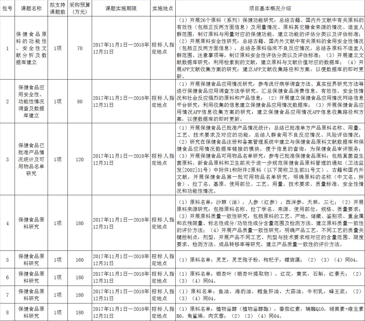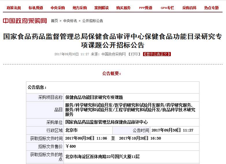 为落实国家食品药品监督管理总局保健食品原料目录、保健功能目录年度制修定计划,根据《食品安全法》《保健食品注册与备案管理办法》等关于保健食品原料目录保健功能目录的有关规定,我中心委托国信招标集团股份有限公司对“保健食品原料目录研究” (招标编号:GXTC-1770075)、“保健食品功能目录研究” (招标编号:GXTC-1770100)进行国内公开招标,诚请符合投标人要求的单位和组织积极参加投标。招标公告链接如下: