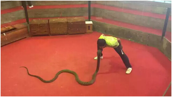 令人倍感胆寒的是,以往我们只有在电影中看到的“人蛇大战”,居然被搬到了现实中,其中一位同伴在大家的鼓舞下,还亲身体会了“与蛇共舞”的惊险一刻。